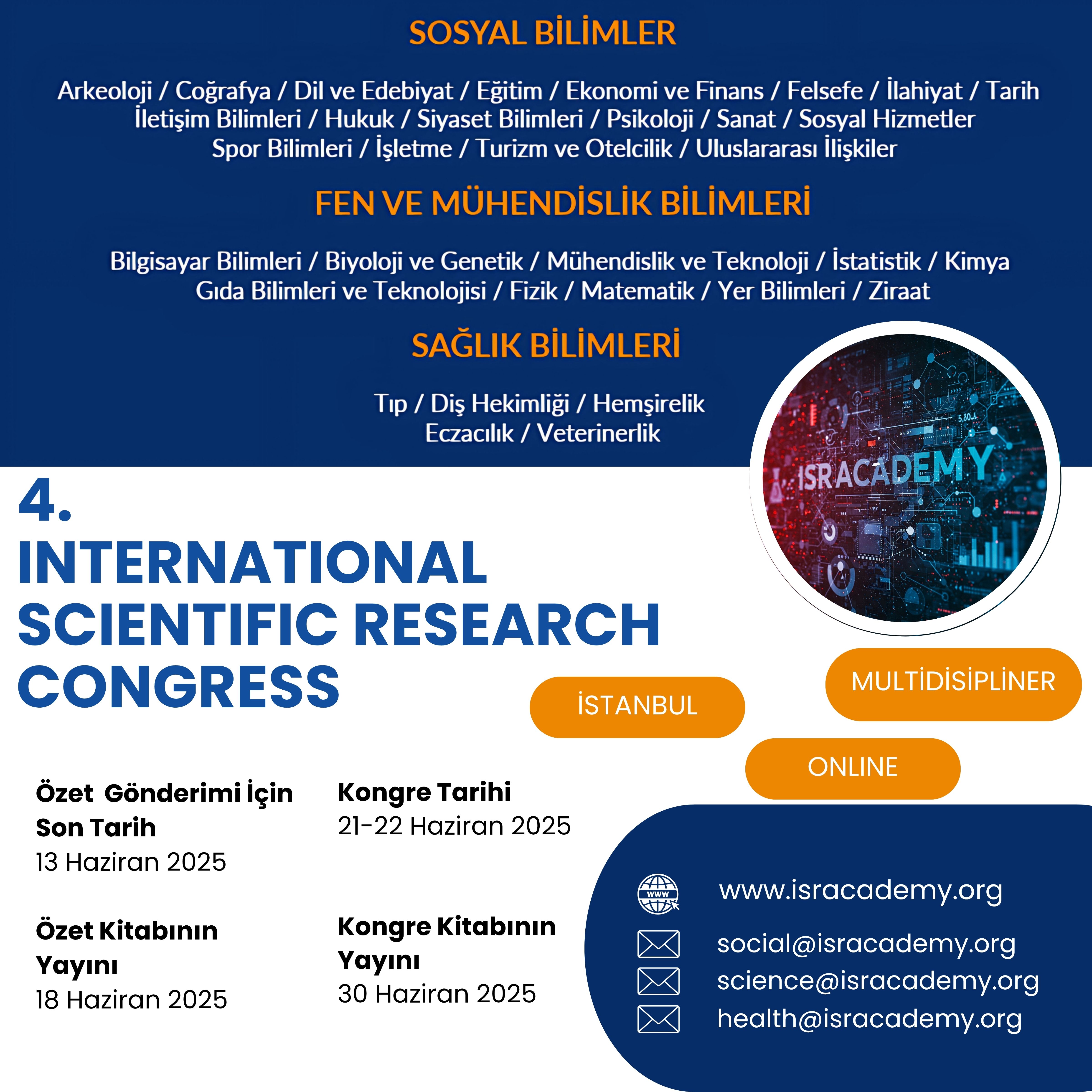 21-22 Haziran tarihlerinde ONLINE olarak düzenleyeceğimiz 4. International Scientific Research Congress'in başvuru ve değerlendirme süreçleri sona ermiştir. İlginiz için teşekkür ederiz. Sonraki kongrelerimize kaıtlmak için ilgili menüden tarihleri inceleyebilirisniz.